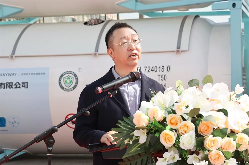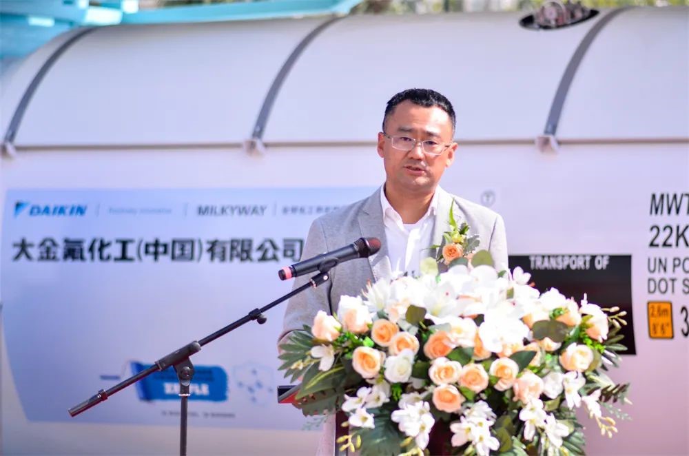 上午10點58分,下線儀式準時開始,中集環(huán)科季國祥總經(jīng)理代表制造商致辭,他表示,密爾克衛(wèi)、大金氟化工、中集環(huán)科分別作為化工倉儲物流、精細化工、能源化工物流裝備領域的佼佼者,不忘各自肩負的使命和責任,敬畏環(huán)境,敬畏生命,在綠色發(fā)展、低碳發(fā)展、可持續(xù)發(fā)展方面取得了令人驕傲的成績,作出了敢想敢為的表率。本次下線的氣體箱產(chǎn)品采用了創(chuàng)新的新材料、新工藝,在筒體和框架采用了大金氟化工新一代4F型高固體分、低VOC環(huán)保氟碳樹脂油漆,具有超長耐候、優(yōu)良的防腐性能;同時,罐內也率先采用了氟盾水性漆,與傳統(tǒng)的鍍鋅工藝相比,不僅兼容性能更好,而且更加綠色環(huán)保,也便于日后維護。這些新技術的應用淋漓盡致地體現(xiàn)了三家企業(yè)在追求綠色發(fā)展、低碳發(fā)展上相同的理念和作出的努力,中集環(huán)科非常榮幸未來繼續(xù)與密爾克衛(wèi)、大金氟化工一起成長,成為全球化工物流綠色發(fā)展、高質量發(fā)展的倡導者和創(chuàng)新者。